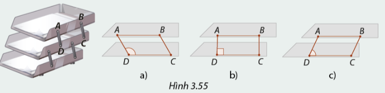 1. Trong Hình 3.55, tầng trên của khay đựng giấy được gắn với tầng dưới bởi hai thanh AD, BC với \(AB = DC,AD = BC.\) Ta có thể đưa tầng trên của khay ra trước hoặc về sau bằng cách thay đổi góc ADC. Em hãy cho biết: