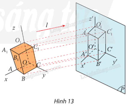 Vậy ảnh của hình hộp chữ nhật OABC.O1A1B1C1 và ảnh của các tia Ox, Oy, Oz qua phép chiếu song song theo phương l lên mặt phẳng (P) lần lượt là hình hộp chữ nhật và các tia O’x’, O’y’, O’z’.