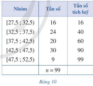 Trong phòng thí nghiệm, người ta chia 99 mẫu vật thành năm nhóm căn cứ trên khối lượng của chúng (đơn vị: gam) và lập bảng tần số ghép nhóm bao gồm cả tần số tích lũy như Bảng 10.