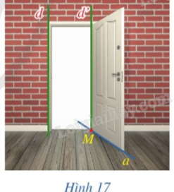 Hình 17 mô tả một cửa gỗ có dạng hình chữ nhật, ở đó nẹp cửa và mép dưới cửa lần lượt gợi nên hình ảnh hai đường thẳng d và a. Điểm M là vị trí giao giữa mép gắn bản lề và mép dưới của cửa. Hãy giải thích tại sao khi quay cánh cửa, mép dưới cửa là những đường thẳng a luôn nằm trên mặt phẳng đi qua điểm M cố định và vuông góc với đường thẳng d.