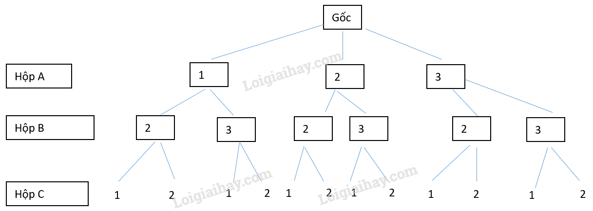 Có ba hộp A, B, C. Hộp A có chứa ba thẻ mang số 1, số 2 và số 3. Hộp B chứa hai thẻ mang số 2 và số 3. Hộp C chứa hai thẻ mang số 1 và số 2. Từ mỗi hộp ta rút ra ngẫu nhiên một thẻ.