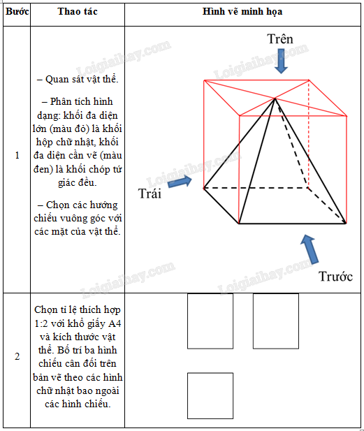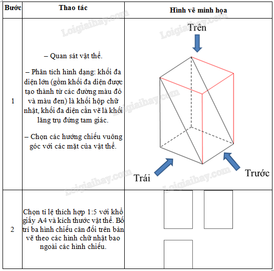 – Quan sát vật thể, phân tích hình dạng và chọn các hướng chiếu vuông góc với các mặt của vật thể.