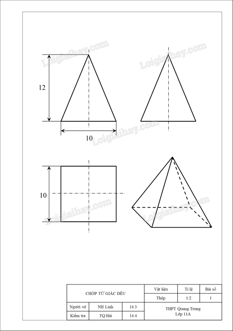 Bản vẽ kĩ thuật trên khổ giấy A4 gồm ba hình chiếu và các kích thước của chi tiết cơ khí “Chóp tứ giác đều” có chiều cao 12 cm và cạnh đáy 10 cm là:
