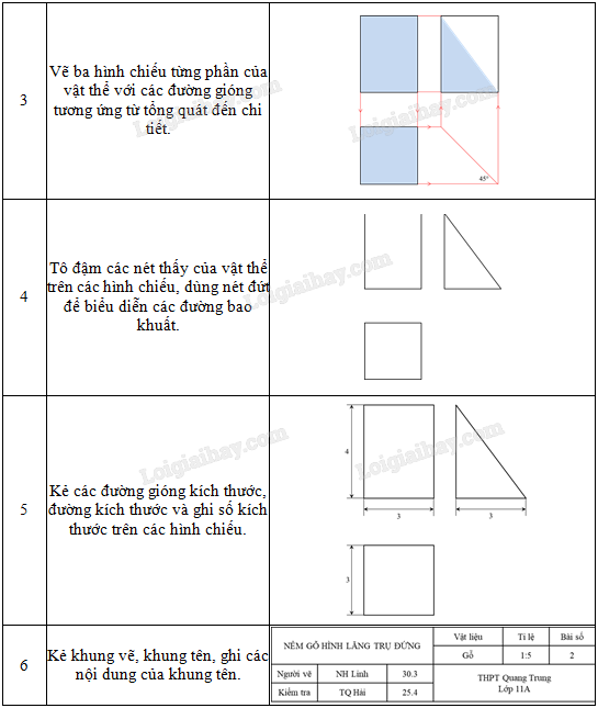 – Vẽ ba hình chiếu từng phần của vật thể với các đường gióng tương ứng từ tổng quát đến chi tiết.