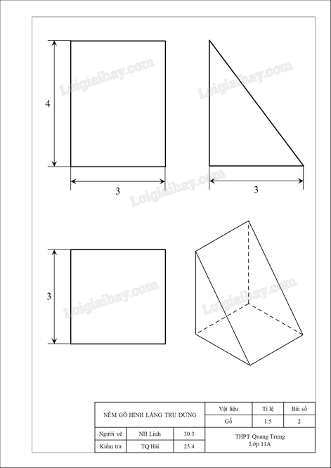 Bản vẽ kĩ thuật trên khổ giấy A4 gồm ba hình chiếu và các kích thước của cái “nêm gỗ hình lăng trụ đứng” có hình chiếu trục đo như Hình 12 là: