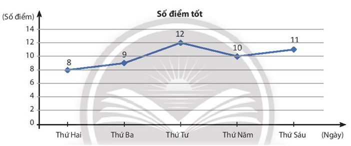 Số điểm tốt các bạn học sinh lớp 7B đạt được trong một tuần được cho ở biểu đồ đoạn thẳng sau. Chọn ngẫu nhiên một ngày trong tuần. Biết rằng khả năng cả 5 ngày được chọn đều như nhau. Tính xác suất của biến cố: