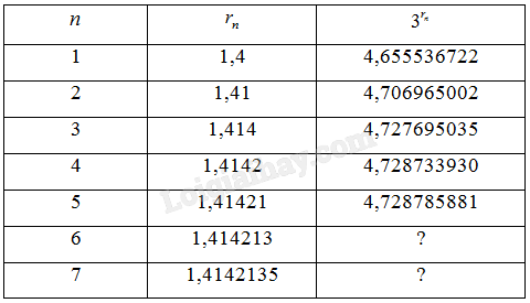 a) Bảng dưới cho biết những số hạng đầu tiên của dãy số \(\left( {{3^{{r_n}}}} \right)\) (làm tròn đến chữ số thập phân thứ chín). Sử dụng máy tính cầm tay, hãy tính số hạng thứ 6 và thứ 7 của dãy số này.