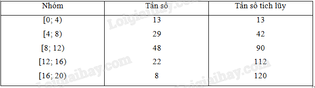 Giáo viên chủ nhiệm chia thời gian sử dụng Internet trong một ngày của 40 học sinh thành năm nhóm (đơn vị: phút) và lập bảng số ghép nhóm bao gồm cả tần số tích lũy như Bảng 12