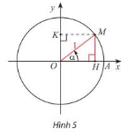 a) Trong Hình 5, M là điểm biểu diễn của góc lượng giác \(\alpha \) trên đường tròn lượng giác. Ta có: