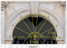 Trong bài toán khởi động, cho biết vòm cổng rộng 120 cm và khoảng cách từ B đến đường kính AH là 27 cm. Tính \(\sin \alpha \) và \(\cos \alpha \), từ đó tính khoảng cách từ điểm C đến đường kính AH. Làm tròn kết quả đến hàng phần mười.