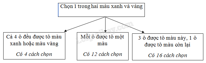 Để trang trí một tờ giấy có dạng hình chữ nhật, bạn Thùy chia tờ giấy đó thành bốn hình chữ nhật nhỏ bằng nhau. Mỗi hình chữ nhật nhỏ được tô bằng một trong hai màu xanh hoặc vàng. Vẽ sơ đồ hình cây biểu thị các khả năng mà bạn Thùy có thể tô màu trang trí cho tờ giấy đó.