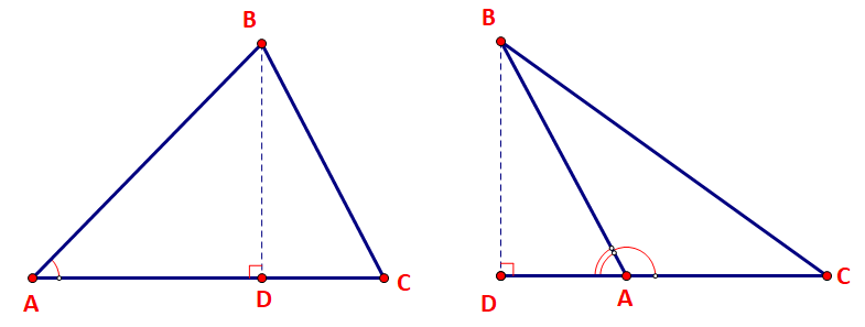 \(\sin A = \sin ({180^o} – A) = \frac{{BD}}{{AB}} \Rightarrow BD = AB.\sin A\)
