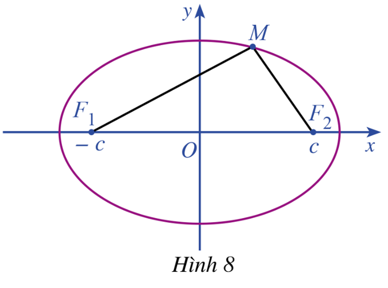 Giả sử đường elip (E) là tập hợp các điểm M trong mặt phẳng sao cho \(M{F_1} + M{F_2} = 2a\), ở đó \({F_1}{F_2} = 2c\) với \(0 < c < a\). Ta chọn hệ trục tọa độ \(Oxy\) có gốc là trung điểm của đoạn thẳng \({F_1}{F_2}\). Trục \(Oy\) là đường trung trực của \({F_1}{F_2}\) và \({F_2}\) nằm trên tia \(Ox\) (Hình 8). Khi đó \({F_1}( – c;0),{F_2}(c;0)\) là các tiêu diểm của elip (E)