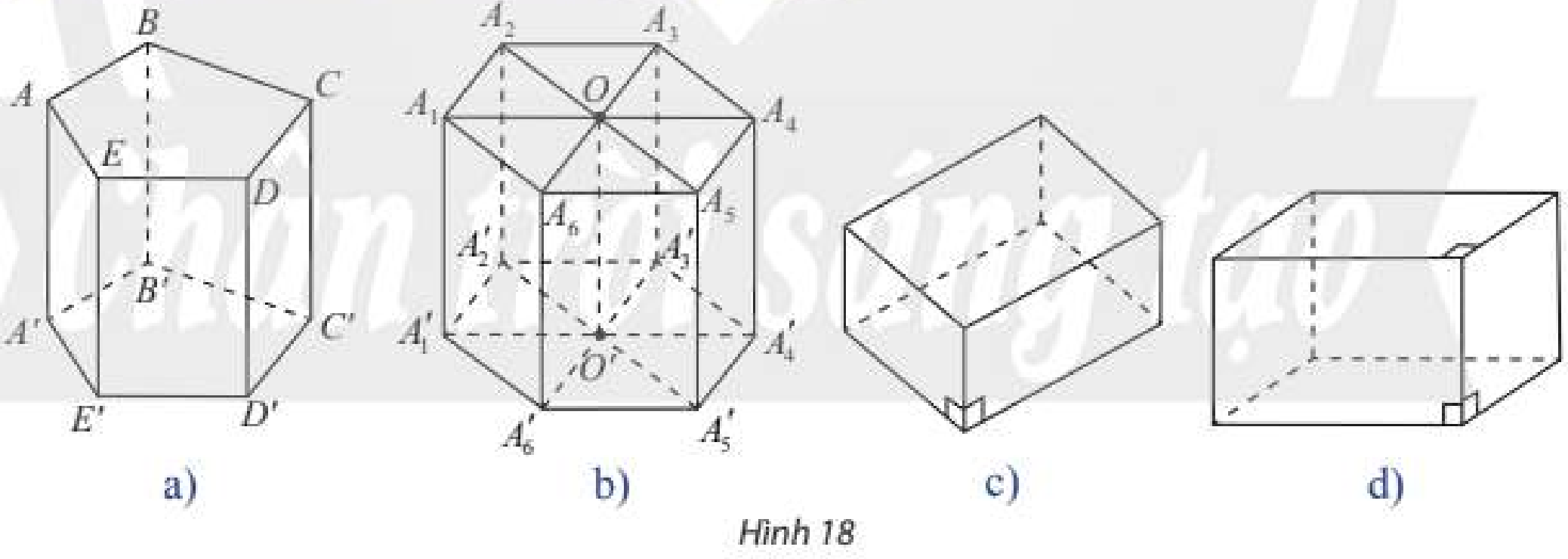 a) Cho hình lăng trụ (ABCDE.A'B'C'D'E') có cạnh bên (AA') vuông góc với một mặt phẳng đáy (Hình 18a). Có nhận xét gì về các mặt bên của hình lăng trụ này?