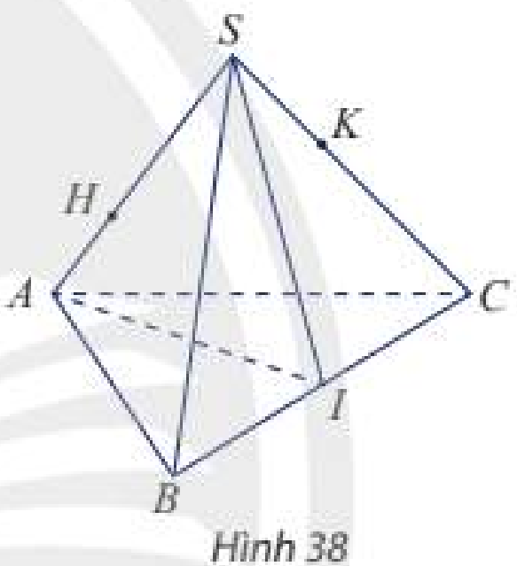 Cho tứ diện \(SABC\). Gọi \(H,K\) lần lượt là hai điểm trên hai cạnh \(SA\) và \(SC\left( {H \ne S,A;K \ne S,C} \right)\) sao cho \(HK\) không song song với \(AC\). Gọi \(I\) là trung điểm của \(BC\) (Hình 38).