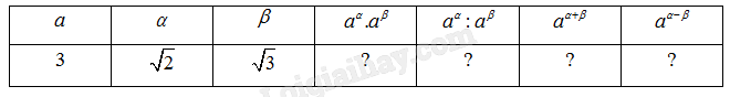 \(\begin{array}{l}{a^\alpha }.{a^\beta } = {3^{\sqrt 2 }}{.3^{\sqrt 3 }} \approx 31,70659\\{a^\alpha }:{a^\beta } = {3^{\sqrt 2 }}:{3^{\sqrt 3 }} \approx 0,70527\\{a^{\alpha  + \beta }} = {3^{\sqrt 2  + \sqrt 3 }} \approx 31,70659\\{a^{\alpha  – \beta }} = {3^{\sqrt 2  – \sqrt 3 }} \approx 0,70527\end{array}\)