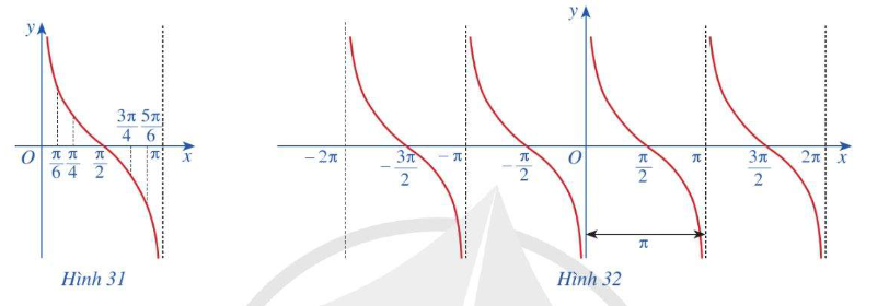 c)     Làm tương tự như trên đối với các khoảng \(\left( {\pi ;2\pi } \right),\left( { – \pi ;0} \right),\left( { – 2\pi ; – \pi } \right),….\)ta có đồ thị hàm số \(y = \cot x\)trên E được biểu diễn ở Hình 32.