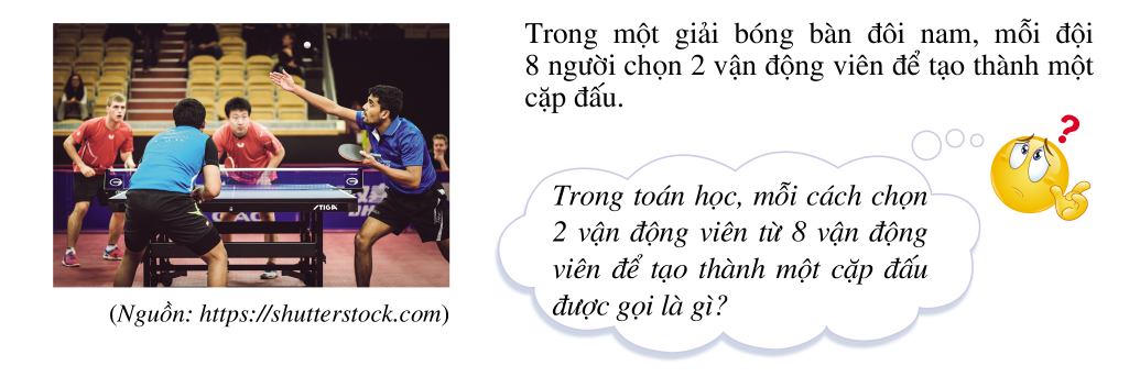 Trong toán học, mỗi cách chọn 2 vận động viên từ 8 vận động viên để tạo thành một cặp đấu được gọi là một tổ hợp chập 2 của 8.