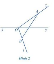Cho đường thẳng xy. Từ một điểm O trên đường thẳng xy, ta vẽ hai tia Oz và Ot như Hình 2. a) Lấy điểm A bất kì trên tia Oz (A khác O), lấy điểm B bất kì trên tia Ot (B khác O), vẽ đoạn thẳng AB. b) Đoạn thẳng AB có cắt đường thẳng xy hay không?