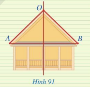 Hình 91 mô tả mặt cắt đứng của một ngôi nhà với hai mái là OA và OB, mái nhà bên trái dài 3 m. Tính chiều dài mái nhà bên phải, biết rằng điểm O thuộc đường trung trực của đoạn thẳng AB.