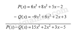 \(\begin{array}{l}P(x) – Q(x) = 6{x^3} + 8{x^2} + 5x – 2 – ( – 9{x^3} + 6{x^2} + 2x + 3)\\ = 6{x^3} + 8{x^2} + 5x – 2 + 9{x^3} – 6{x^2} – 2x – 3\\ = (6 + 9){x^3} + (8 – 6){x^2} + (5 – 2)x + ( – 2 – 3)\\ = 15{x^3} + 2{x^2} + 3x – 5\end{array}\)