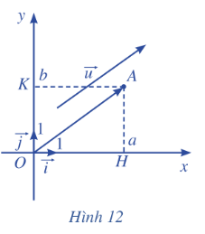 Trong mặt phẳng toạ độ Oxy, cho vectơ\(\overrightarrow u {\rm{ }} = {\rm{ }}\left( {a;{\rm{ }}b} \right)\) . Ta chọn điểm A sao cho\(\overrightarrow {OA} {\rm{ }} = {\rm{ }}\overrightarrow u \) . Xét vectơ đơn vị \(\overrightarrow i \) trên trục hoành Ox và vectơ đơn vị \(\overrightarrow j \) ở trên trục tung Oy (Hình 12).