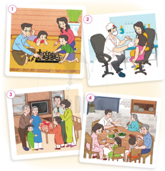 – Tranh 1: Buổi tối, sau khi ăn cơm xong, cả gia đình Hà tập trung ở phòng khách. Bố và anh trai chơi cờ vua. Còn mẹ và Hà ngồi bên cạnh cổ vũ.