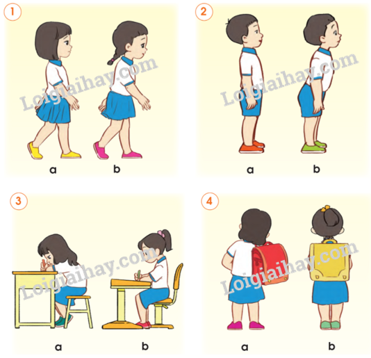Các bạn hình 1b, 2b, 3a, 4a có cách đi, đứng, ngồi và đeo cặp sách của các bạn ở hình nào có thể dẫn đến cong vẹo cột sống. Vì các tư thế này khiến cho cột sống không thẳng, bị biến dạng.