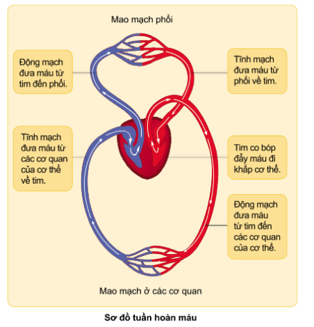 – Vòng tuần hoàn lớn: Đưa máu chứa nhiều khí ô-xi và chất dinh dưỡng từ tim đi nuôi cơ thể, đồng thời nhận khí các-bo-nic và các chất thải của các cơ quan rồi trở về tim.