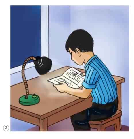 Ánh sáng từ đèn đã chiếu sáng quyển sách. Ánh sáng phản chiếu từ quyển sách đi tới mắt và mắt nhìn thấy được quyển sách.