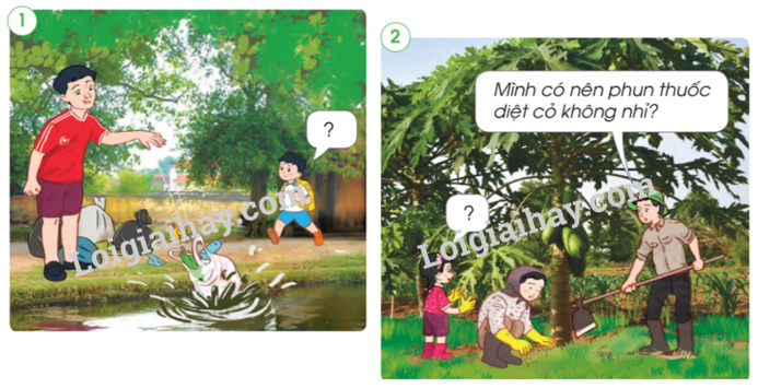Em bé: Bố ơi bố không nên dùng thuốc diệt cỏ đâu, thuốc diệt cỏ có thể gây ô nhiễm môi trường đất. Có rất nhiều loài động vật dùng cỏ làm thức ăn, nếu chúng ăn phải cỏ có thuốc chúng cũng sẽ bị nhiễm độc và chết đấy ạ.