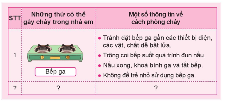 Dựa vào các nguyên nhân dễ gây cháy nhà để xác định các vật dễ gây cháy (bàn là, bếp gas, bếp điện,…) sau đó tìm hiểu thông tin về cách phòng cháy (từ kiến thức cá nhân, người thân, bạn bè, các nguồn trên internet,…)