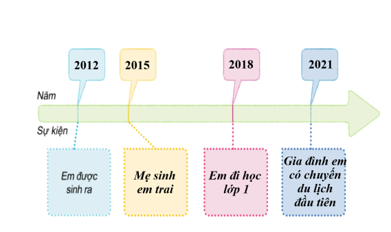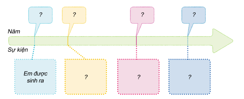 1. Với sự hỗ trợ của người thân, hãy vẽ đường thời gian theo thứ tự các sự kiện lớn đã diễn ra trong gia đình của em.