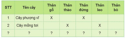 Kể tên một số cây thân gỗ hoặc thân thảo mà em biết. Chúng có thân đứng, thân leo hay thân bò. Hoàn thành bảng theo gợi ý dưới đây.