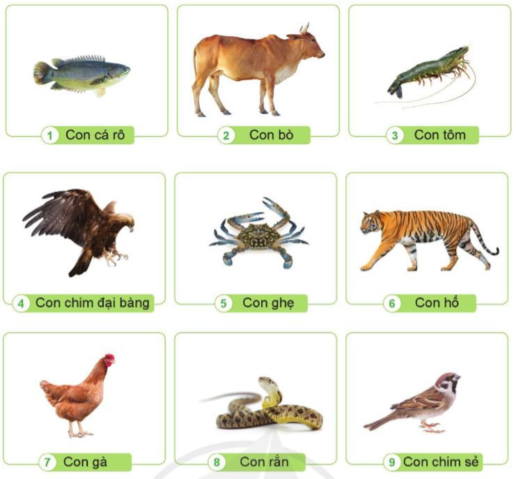 2. Xếp các con vật trong hình trên vào các nhóm theo gợi ý dưới đây.