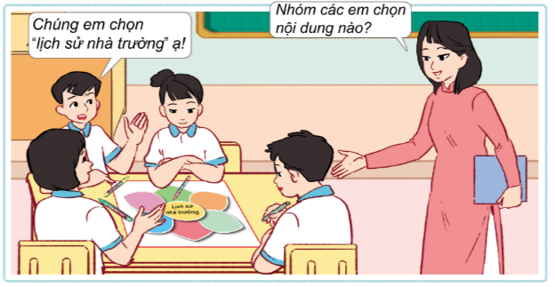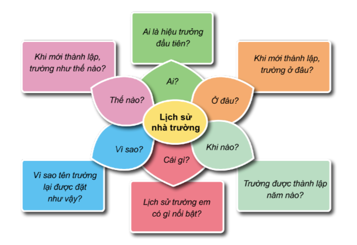 Lựa chọn một nội dung để tìm hiểu về truyền thống trường em. Đặt các câu hỏi để thu thập thông tin cho nội dung mà nhóm em đã lựa chọn dựa vào gợi ý dưới đây.