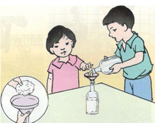 Hãy dùng phễu có lót bông để lọc hai chai nước