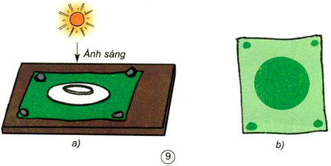 Dùng một miếng vải được nhuộm phẩm màu xanh phơi ra nắng, lấy một cái đĩa sứ và bốn hòn đá chận lên như hình9a. Phơi như vậy khoảng ba, bốn ngày liền. Sau đó lấy miếng vải vào thì thấy kết quả như hình 9b.