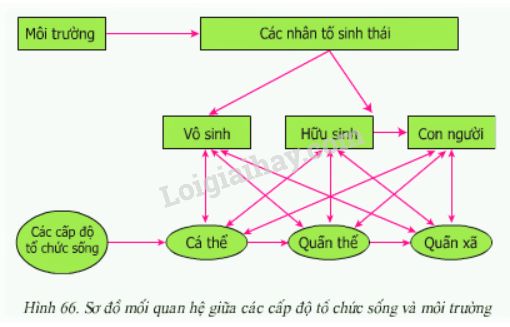 – Sự tác động qua lại giữa môi trường và các cấp độ tổ chức sống được thể hiện qua sự tương tác giữa các nhân tố sinh thái (nhân tố vô sinh và nhân tố hữu sinh) với từng cấp độ tổ chức sống.