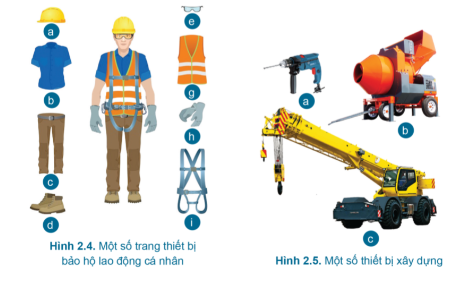 1. Hãy nêu tên các trang thiết bị bảo hộ lao động cá nhân và các thiết bị xây dựng trong Hình 2.4 và hình 2.5