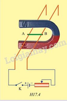 Mắc mạch điện như hình H17.4. Đoạn dây dẫn thẳng AB bằng đồng (hoặc nhôm) đặt trên hai thanh ray nằm ngang cũng bằng đồng (hoặc nhôm) trong từ trường của một nam châm. Đóng công tắc K, ta thấy đoạn dây AB chuyển động trên hai thanh ray. Do đâu có lực tác dụng làm chuyển động đoạn dây AB?