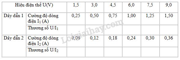 Trong một thí nghiệm khảo sát sự phụ thuộc của I vào U với hai đầu dây dẫn khác nhau và sai số của dụng cụ đo không đáng kể, người ta lập được bảng số liệu sau (Bảng 1).