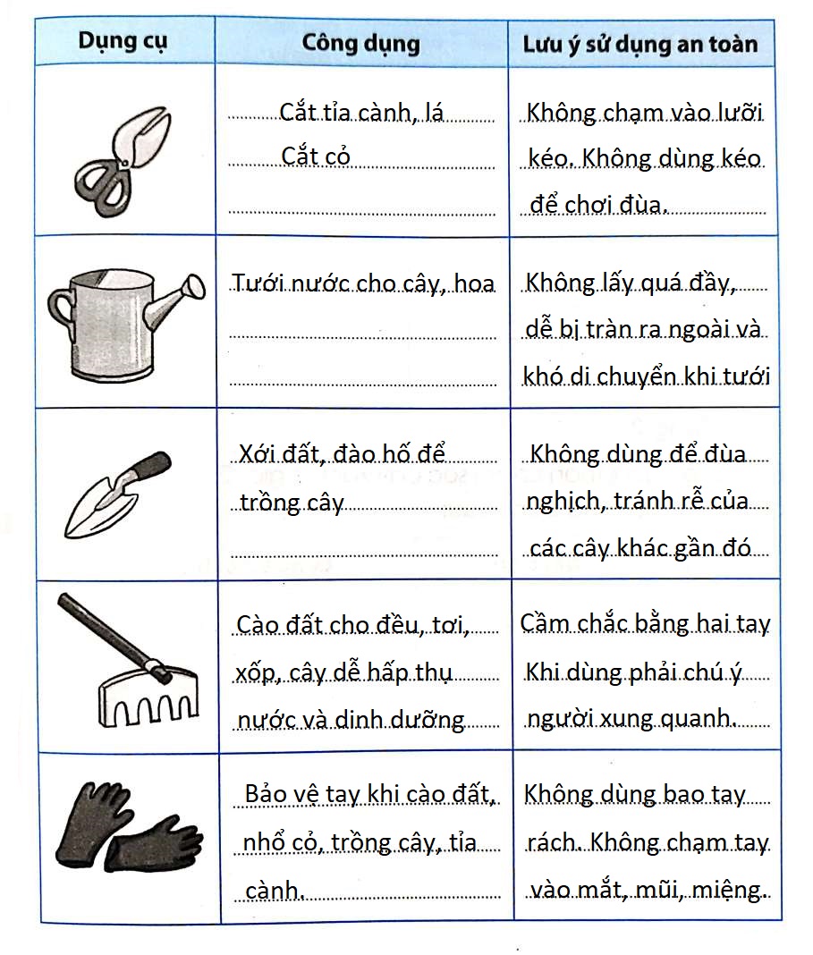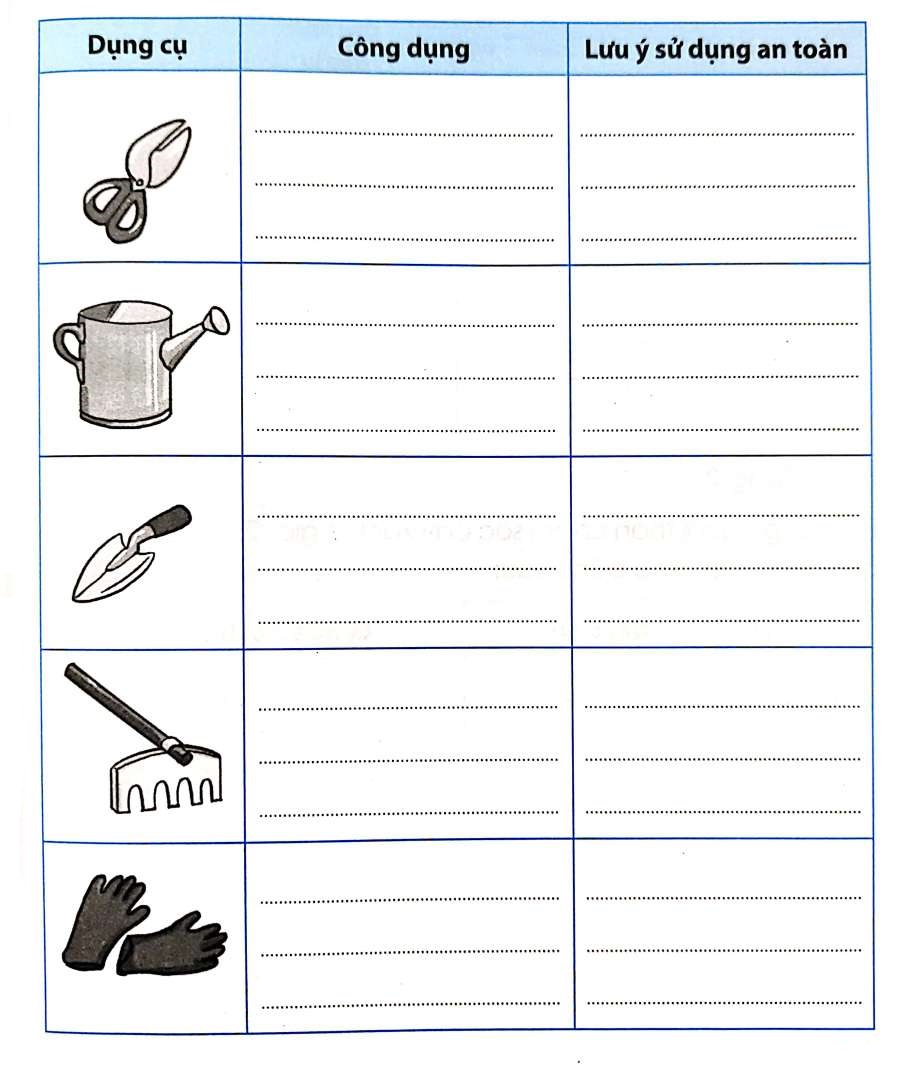 Các dụng cụ trong hình dưới đây được sử dụng để chăm sóc cây xanh. Em hãy nêu công dụng và lưu ý để sử dụng an toàn các dụng cụ đó.