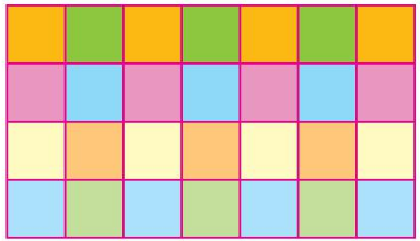 – Mỗi nhóm sử dụng thước kẻ, bút để chia hết tờ giấy hình chữ nhật đã chuẩn bị thành các hình vuông bằng nhau (mỗi hình vuông có độ dài cạnh bằng ƯCLN(28,16) xăng-ti-mét), sau đó tô màu sao cho hai ô liền nhau không cùng màu (xem hình minh hoạ).