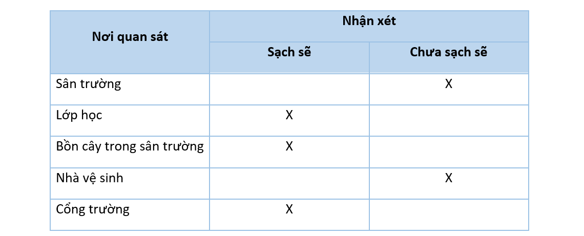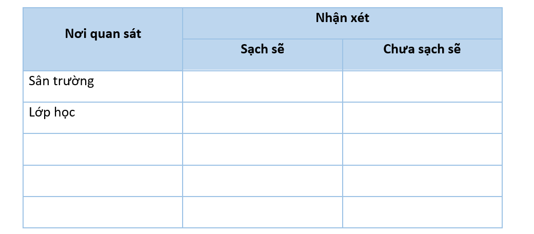 Hướng dẫn: Em hãy quan sát các khu vực xung quanh trường, lớp em và nhận xét xem chúng đã sạch sẽ chưa (nhiều lá rụng, có rác, có mùi hôi…)