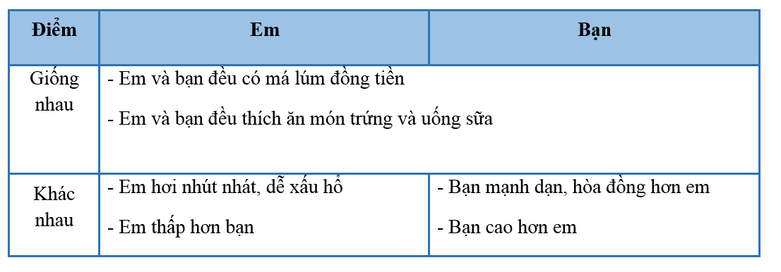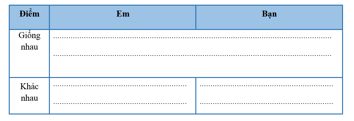 Em hãy trao đổi với bạn ngồi cạnh để tìm những điểm giống và khác nhau giữa em và bạn (về ngoại hình, tính cách, sở thích…) rồi ghi vào bảng sau: