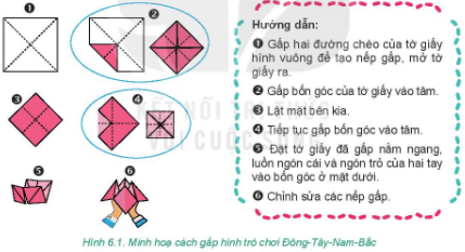 1. Nếu đảo thứ tự bước 3 và 4 trong hướng dẫn trên thì em có gấp được hình trò chơi Đông – Tây – Nam – Bắc không? Tại sao? 2. Trước khi thực hiện theo hướng dẫn trên, em cần có gì? Sau khi thực hiện lần lượt 6 bước theo hướng dẫn, em nhận được kết quả là gì?