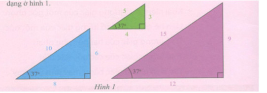Tỉ số giữa cạnh đối và cạnh kề của góc \({37^o}\) trong các tam giác vuông đồng dạng ở hình 1 bằng nhau.