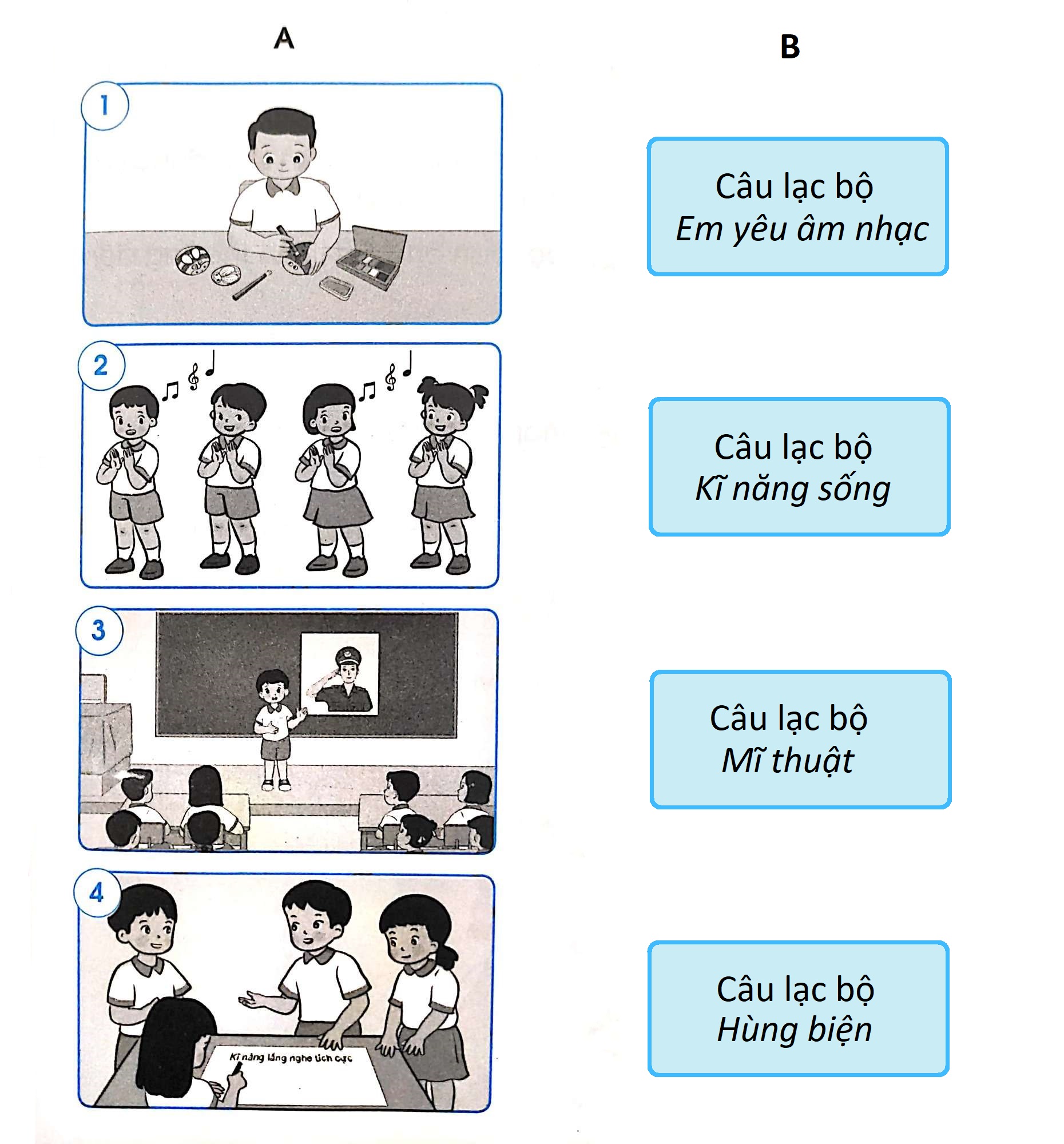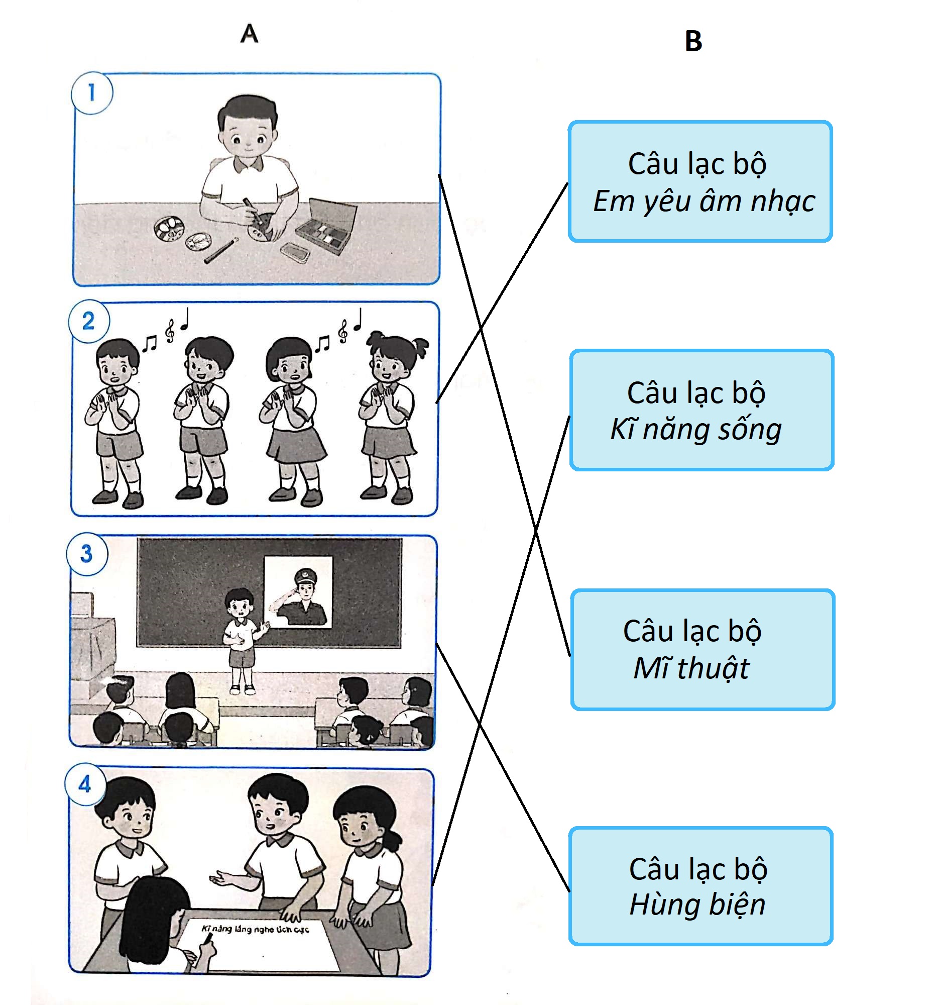 Nhìn vào các hình 1, 2, 3, 4 em cảm thấy các bạn đang làm gì? Hoạt động ấy phù hợp với câu lạc bộ nào ở cột B?