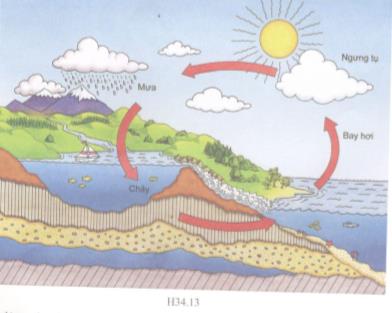 – Vòng tuần hoàn của nước (hình H34.13): ánh sáng mặt trời khiến nước biển và cây cối ấm nóng lên, hơi nước thoát ra bay lên cao rồi chuyển thành mưa  rơi xuống, chảy theo sông, suối,…về lại các đại dương.